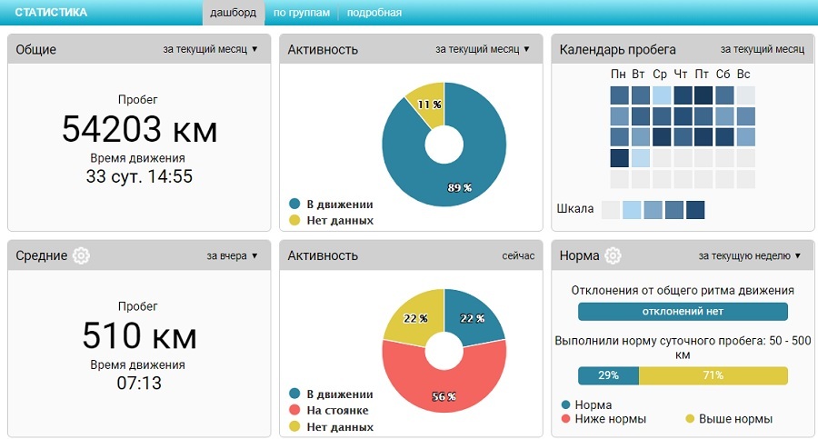 Блок "Активность": Процентное и количественное распределение машин на активных, простаивающх и не имеющих данных. Позволяет оценить насколько эффективно/по́лно используется автопарк.